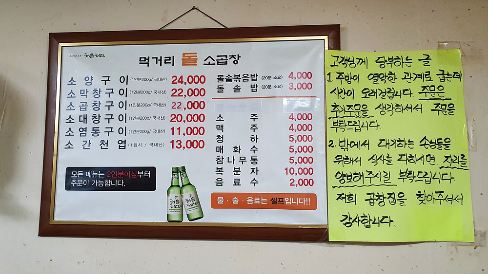 금호동 돌소곱창 간판에 휴대폰 번호가 ㅋㅋㅋㅋ 011로 시작되네요. 매장 크기는 그리 크지 않고 테이블 갯수도 많지 않습니다.(대략 6테이블?) 그리고 별도로 예약같은 것은 되질 않고, 도착하면 입구 화이트보드에 대기자 명단에 전화번호 올려야 하며, 사장님께서 대략 몇분정도 대기해야 한다고 시간을 알려주시지만, 사람들 식사 속도에 따라 다르기 때문에 그냥 참고만...