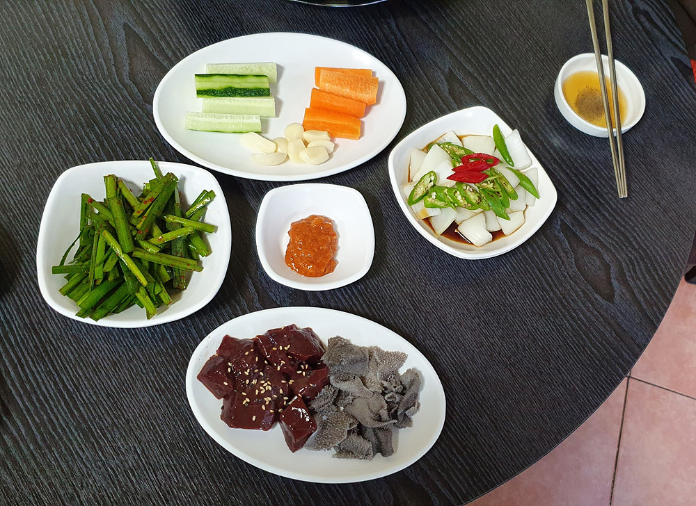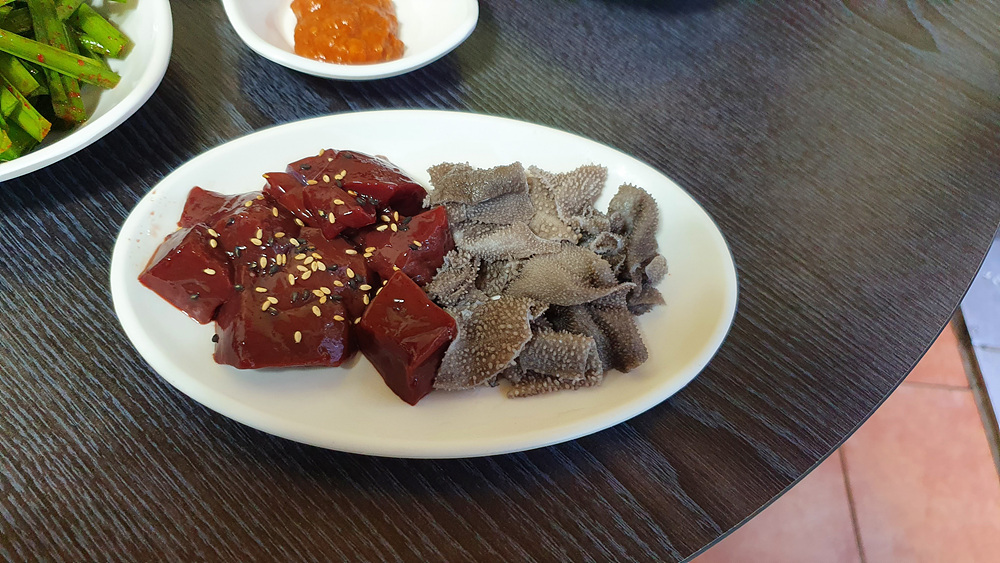 기본반찬 기본반찬이 셋팅되는데, 천엽이랑 생간을.... 서비스로 주시네요. 나이먹어서도 아직 생간의 특유맛을 잘 모르지만, 그래도 세네개 정도는 술안주로 맛 있게 먹습니다. 전 오히려 천엽의 꼬들한 맛이 더 좋아 생간보다는 천엽을 즐겨 합니다.