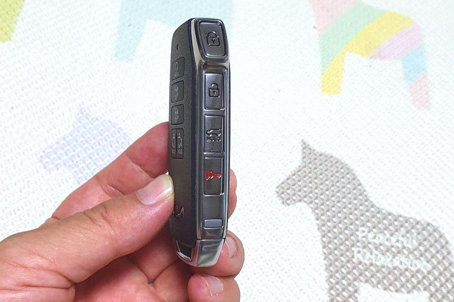 측면 버튼 구성 제일 기본적인 잠금/해제/트렁크/경보음 버튼구성은 측면에 구성되어 있고, 가장 좋은 점은 트렁크를 리모콘을 이용해 열고 / 닫고 가능해졋다는게 좋네요. 현재 타고있는 제네시스는 리모콘으로 전동트렁크를 열기 까지만 하고, 닫는것은 리모콘으로 불가능 합니다. 이게 은근 불편합니다. 하지만 실내에서는 닫기 까지 가능하지만, 리모콘으로 못한다는게ㅎㅎㅎ 하지만 카니발은 슬라이딩도어 그리고 트렁크 모두 열고 닫고 가능하니 무지하게 편안합니다!