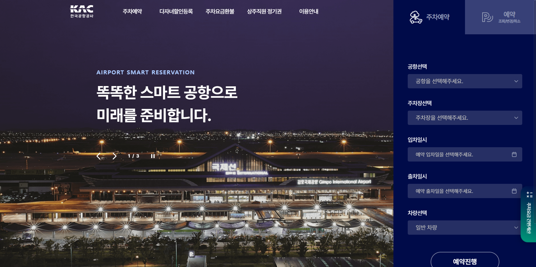 전국 공항 주차홈페이지입니다. 현재 주차공식대행업체는 홈페이지 연결이 원활하지 않아 이거로 대체합니다. 그리고 별도로 예약은 불가하며, 당일 접수만 되는 것으로 확인이 됩니다. 주차장은 별도로 예약은 가능해 만약 대행 없이 직접 주차하시는 경우라면 미리 사전에 예약 후 주차하시면 될 것 같네요.(주말에 예약은 거의 불가능해 보입니다.)