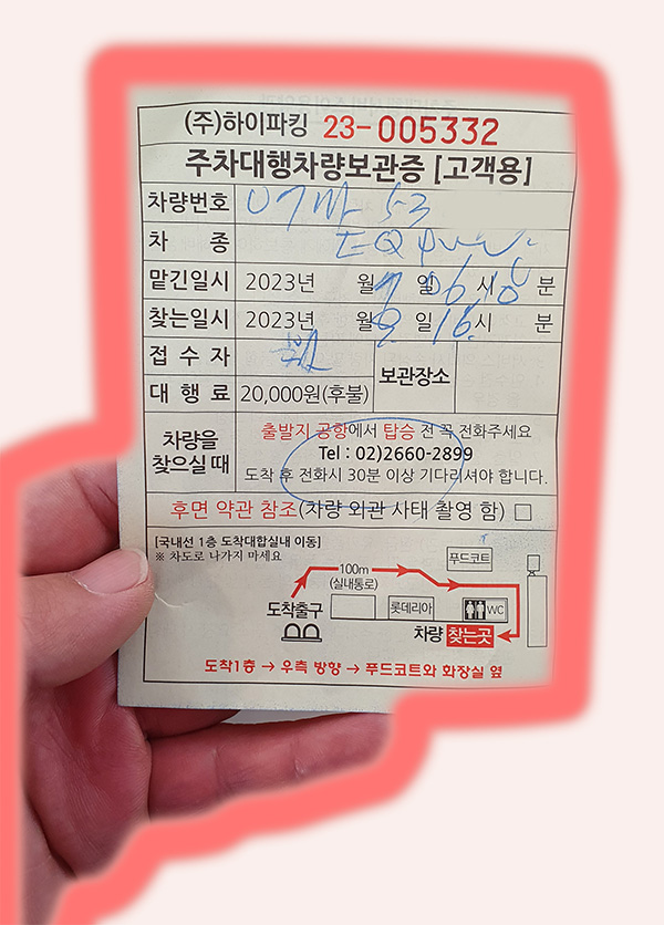 이처럼 보관증을 받아서 비행기 타려 가시면 되고, 오는 날 꼭 미리 전화하셔야 차를 미리 빼놓습니다. 저희는 장애인 차량이라서 그나마 서울 도착할 때쯤 연락해 오래는 기다리지 않았지만 일반차량이라면 도착지 주차장이 복잡해 기다리는 시간이 상당히 오래 걸릴 것으로 보입니다. 저희는 다행스럽게 입구 장애인 주차장이 있어 곧바로 탑승할 수 있었습니다. 처음 해보는 것이라서 실수가 좀 있었지만 그래도 모르면 물어보면서 체크했더니 시간낭비 없이 잘 일처리 하였네요.