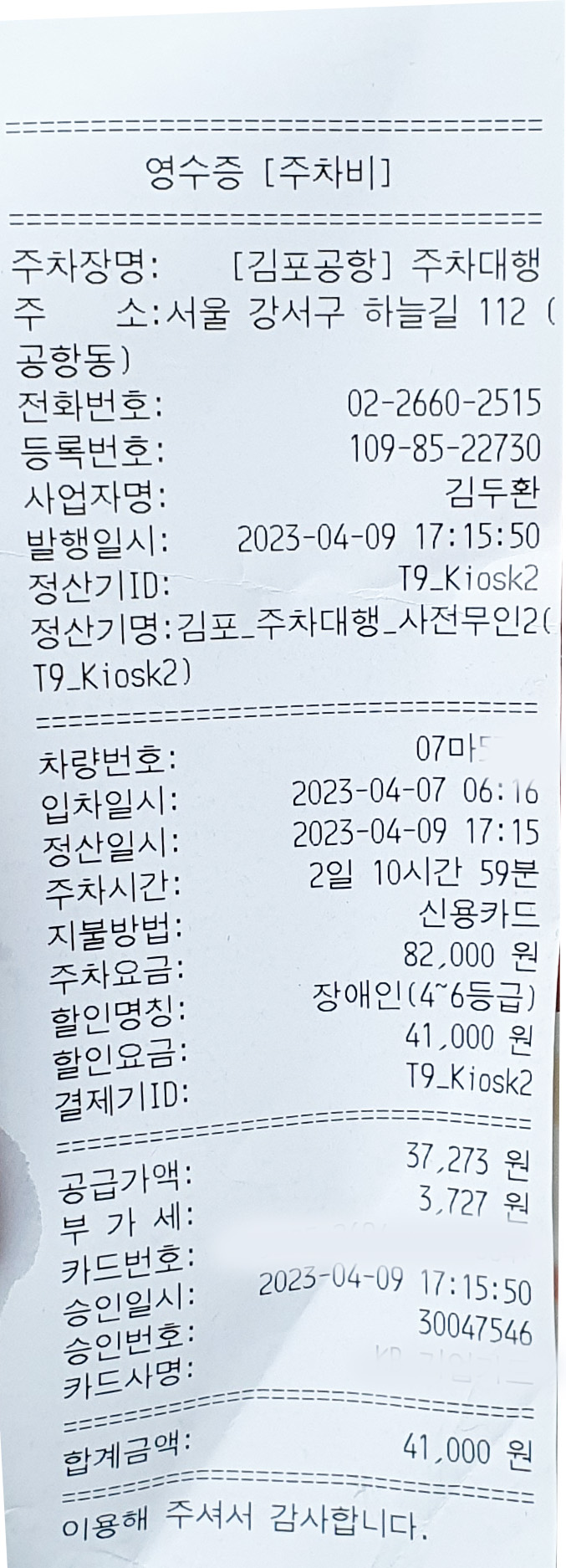 일반차량이면 사실 부담스러울 수 있는 주차비가 나오더군요. 이용시간은 2일 10시간 59분이었는데 주차비는 82,000원 나왔습니다. 하지만 장애인등록차량이다 보니 이 금액에서 50% 할인되어 41,000원이 계산되었고, 그리고 주차대행비(발렛비) 20,000원 별도로 계산됩니다. 61,000원에 편리하게 여행하고 왔다면 엄청난 이득이라 생각합니다. 안 그랬다면 새벽 5시 30분에 택시를 불러 이용했을 테고, 집에 돌아오는 길에도 불편함이 따랐을 텐데 주차공식업체 때문에 엄청 편리하게 다녀왔네요.