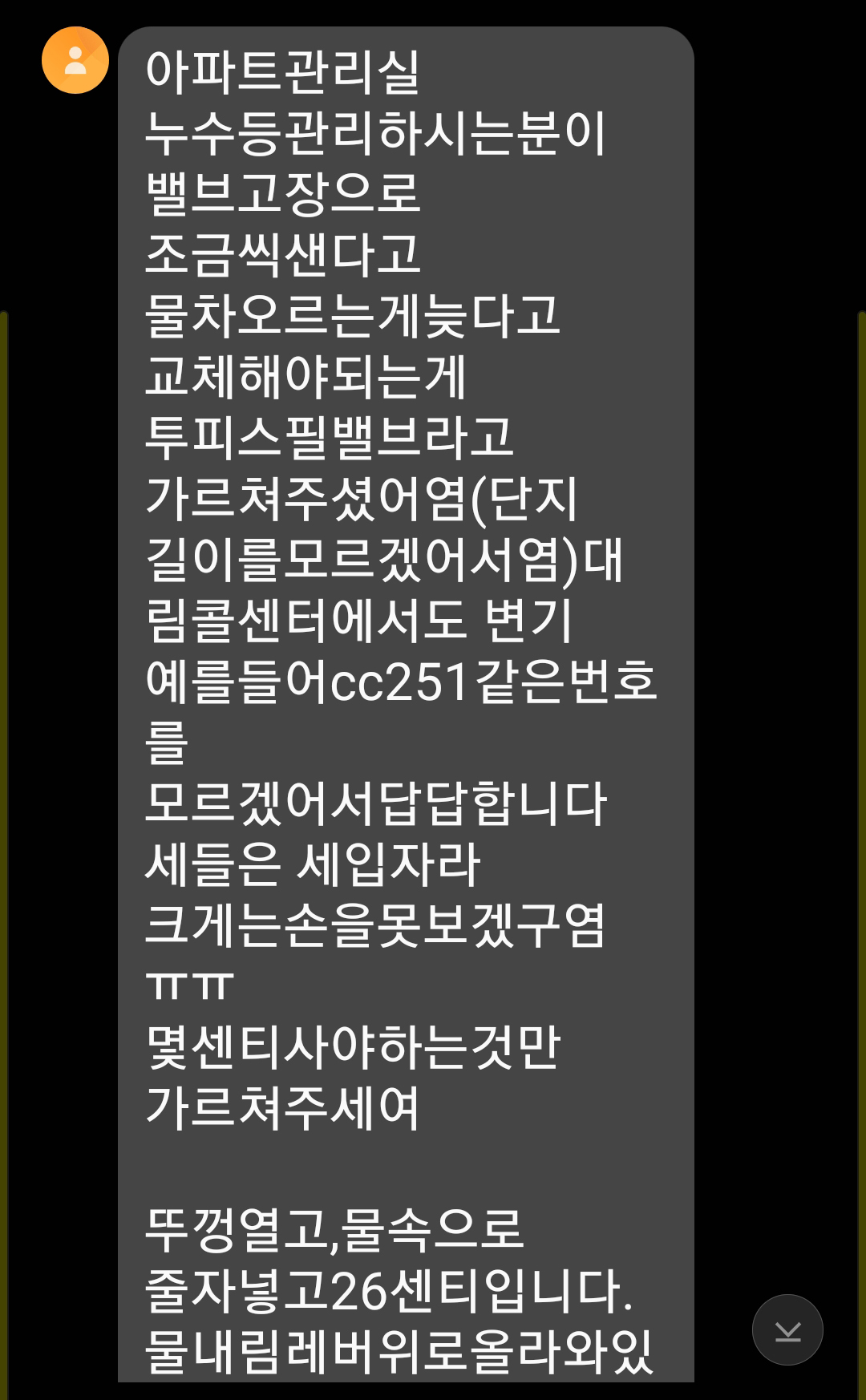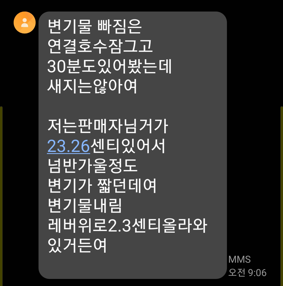 한국사람 같은데 말의 뜻이 이해가 잘 안되도록 적어 놓았네요. 그리고 가장 문제가 되는 아파트 관리실 놈들... 저딴식으로 제대로 정보 확인도 안하고 대충 알려줘 소비자들만 애먹게 만듭니다. 현재 설치된 양변기는 대림바스 CC-258 변기인데 투피스 필밸브 라고 하면서 누수이야기는 뜬금없이??? 진짜 짐심으로 생각이 없다라고 느낌이 드는게 누수 관련 한다는 사람이 물이 빠지는 것과 빠져서 보충되는 것을 구분못하는게 아이러니 합니다.