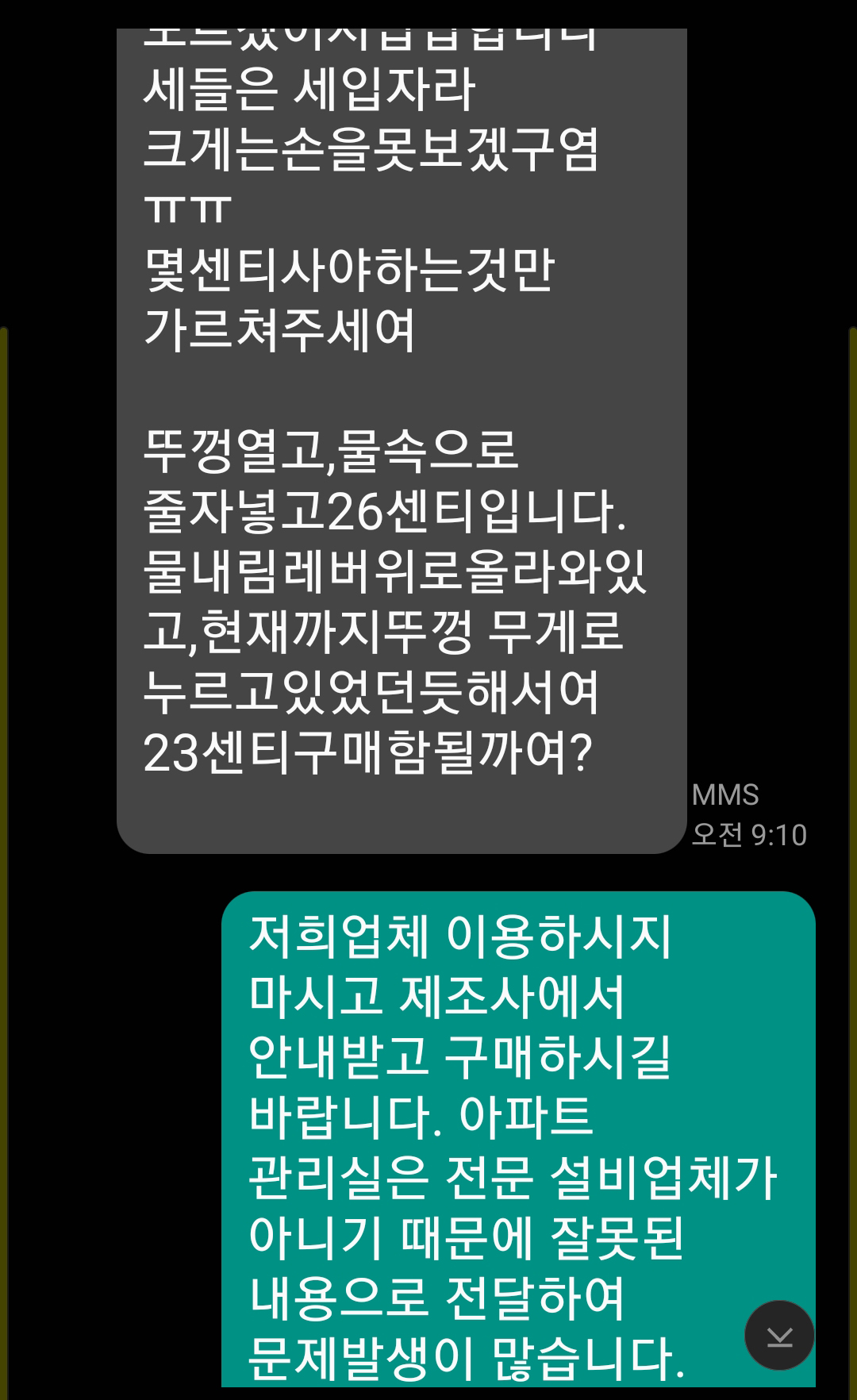 차라리 돈을 드릴테니 직접 구매해 교체해달라 말씀하세요. 이유는 바로 이런 부분 입니다. 사실 아파트 관리실 근무자들은 전문 설비업체 사람들이 아닙니다. 그러다보니 제대로 된 정보도 없이 그냥 눈으로만 보고 대충~ 알려줘 혼선을 일으킵니다. 그리고 나중에 문제가 되면 당연하다는 듯 본인들은 서비스 해주는 건데 정확히 모르지 않느냐 라면서 발뺌하고, 당연히 물품을 구매한 소비자는 제품 판매처에 말도안되는 소리 해가며 트집잡아 반품하려 안간힘 씁니다.(안그런 고객이 더 많이 있지만 일부 악질을 말하는 것)