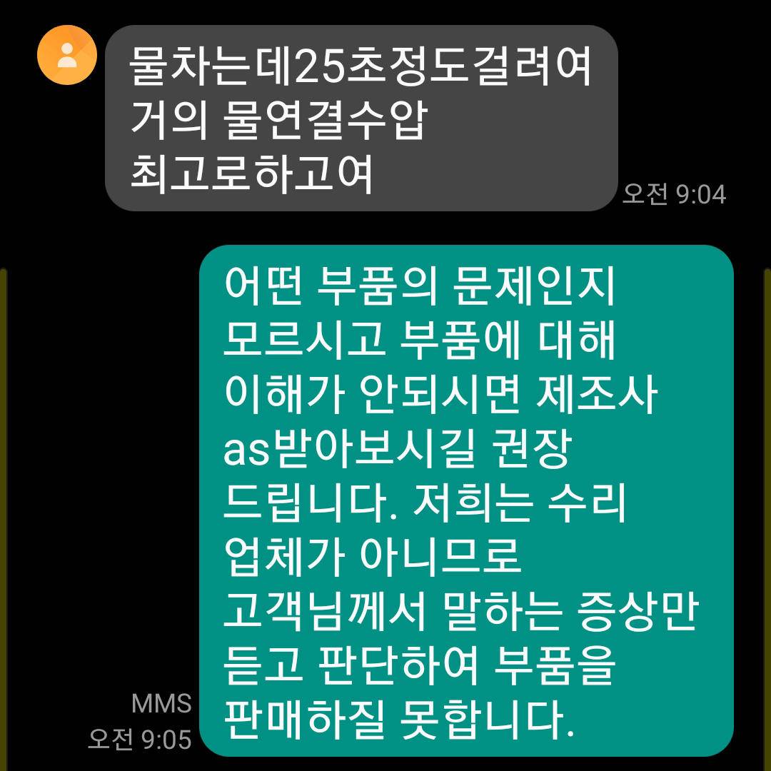 판매처보다 공구를 가지고 와서 땀 뻘뻘 흘리며 작업하는 관리실직원의 말이 더 신빙성 있어 보이기 때문이죠. 하지만 지금까지 부품을 판매한 데이터를 갖고 보면 부품의 불량보다 기존 다른 부품의 노후로 인해 발생된 문제들이 대부분 이었고, 물건을 구매한 소비자에게 부품 원리에 대하여 설명해주면 제대로 이해를 하지 못해 관리실 직원에 전화를 바꿔준 뒤 이야기 해보면 이사람들도 부품 이론에 대해 모르니 답답하기만 합니다.