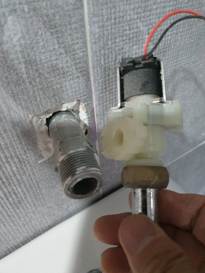 설비업자는 기존 화장실에서 이렇게만 부품을 추출해왔으며 얼마나 똑똑한지 거기에 물을 잠그지 않고 작업하지 않으려고 솔밸브에 달려있는 지수밸브를 벽에 박아놓고 마치 메꾸라 처럼 달아놓고 나와 새로 부품을 구매를 엉뚱한 것을 했던 것 입니다.